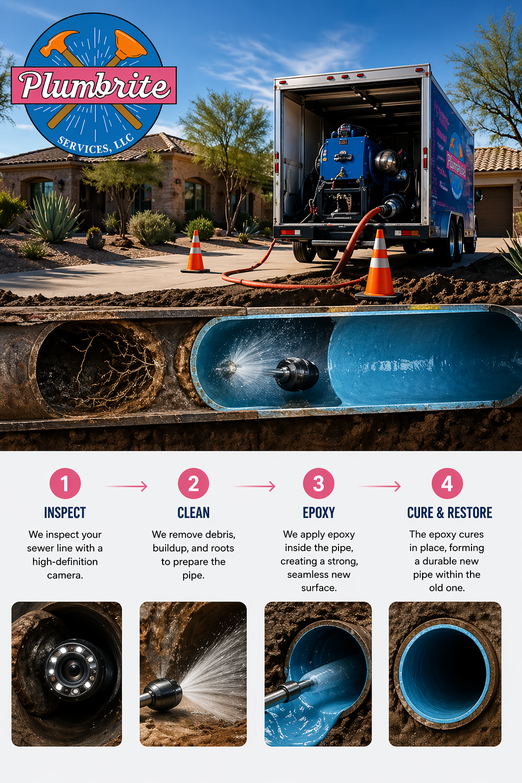 Serving Scottsdale, Phoenix, Fountain Hills, and the surrounding areas, we help homeowners solve serious sewer problems with less disruption and long-lasting results. Plumbrite specializes in trenchless sewer repair, including epoxy pipe lining and CIPP solutions for long-lasting, no-dig pipe restoration.